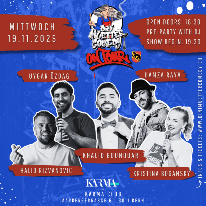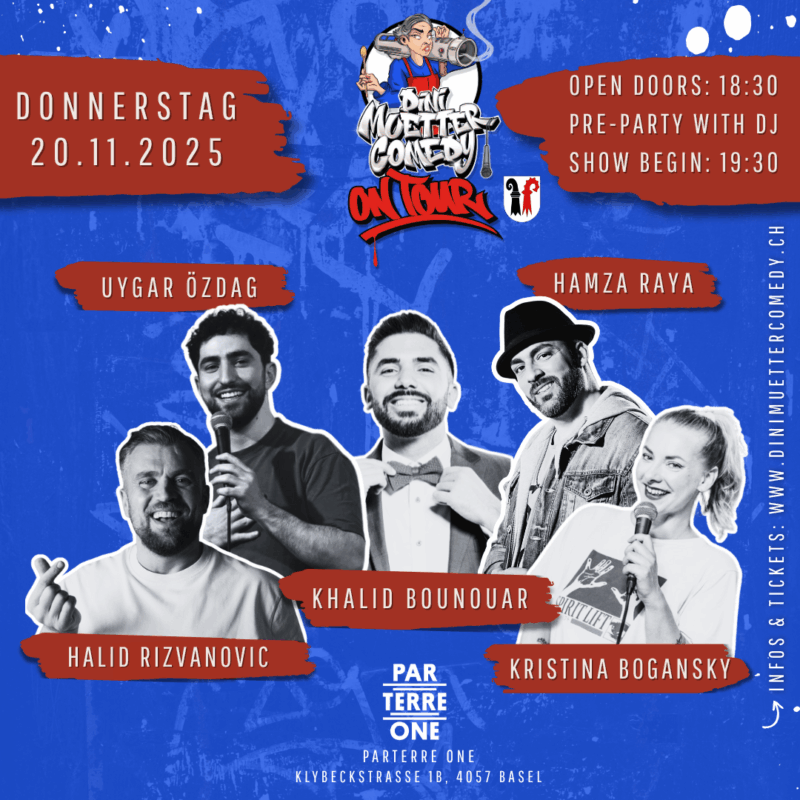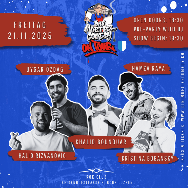 Tickets Search Stadt × BaselBernBern (Lyss)Brunnen (Schwyz)LuzernLuzern (Kriens)St. GallenZürich Datum × JanuarFebruarMärzAprilMaiJuniJuliAugustSeptemberOktoberNovemberDezember Nach Kategorie × Mixed Show - 5 KünstlerMixed Show - 7 KünstlerOpen MicSolo Show Künstler × Aladdin JameelAssane BadianeDaniel LuisHalid RizvanovicHamza RayaKhalid BounouarKristina BoganskyLuanMasud AkbarzadehNikolai BinnerNizarSerdar KaribikUygar Özdag Zurücksetzen Hamza Raya – Comedy NightHamza Raya - Comedy Night 15.11.20258:00 - 22:00Solo ShowTickets Dini Muetter Comedy – Open MicDini Muetter Comedy - Open Mic 16.11.202518:00 - 20:30Zürich Open MicTickets Dini Muetter Comedy – On TourDini Muetter Comedy - On Tour 19.11.202519:30 - 21:30Bern Mixed Show - 5 KünstlerTickets Dini Muetter Comedy – On TourDini Muetter Comedy - On Tour 20.11.202519:30 - 21:30Basel Mixed Show - 5 KünstlerTickets Dini Muetter Comedy – On TourDini Muetter Comedy - On Tour 21.11.202519:30 - 21:30Luzern Mixed Show - 5 KünstlerTickets Daniel Luis – HyperaktivDaniel Luis - Hyperaktiv 26.11.202519:30 - 21:30Zürich Solo ShowTickets Dini Muetter Comedy – Open MicDini Muetter Comedy - Open Mic 30.11.202518:00 - 20:30Zürich Open MicTickets Masud Akbarzadeh – GeishaMasud Akbarzadeh - Geisha 30.11.202518:30 - 20:30Zürich Solo ShowTickets Aladdin Jameel – Und Du?Aladdin Jameel - Und Du? 14.12.202518:00 - 20:00Zürich Solo ShowTickets Dini Muetter Comedy – On TourDini Muetter Comedy - On Tour 19.12.202519:30 - 21:30St. Gallen Mixed Show - 5 KünstlerTickets Dini Muetter Comedy – OriginalDini Muetter Comedy - Original 20.12.202518:00 - 21:30Zürich Mixed Show - 7 KünstlerTickets Dini Muetter Comedy – Open MicDini Muetter Comedy - Open Mic 28.12.202518:00 - 20:30Zürich Open MicTickets Daniel Luis – HyperaktivDaniel Luis - Hyperaktiv 08.01.202619:30 - 21:30Bern (Lyss) Solo ShowTickets Daniel Luis – HyperaktivDaniel Luis - Hyperaktiv 09.01.202620:00 - 22:00St. Gallen Solo ShowTickets Daniel Luis – HyperaktivDaniel Luis - Hyperaktiv 10.01.202620:00 - 22:00Basel Solo ShowTicketsWeitere Events